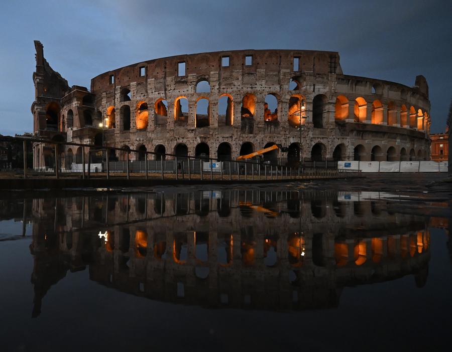 Foto tirada em 13 de julho de 2025 mostra o Coliseu e seu reflexo após chuva em Roma, Itália. (Foto por Alberto Lingria/Xinhua)