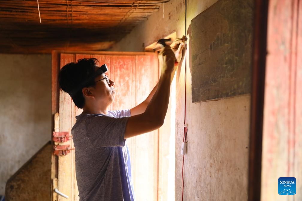 Kenneth Lo, especialista em aprendizagem de serviço da Universidade Politécnica de Hong Kong, instala interruptor de luz em casa de morador do distrito de Gisagara, Ruanda, no dia 16 de julho de 2025. Enfrentando o calor e a poeira no distrito de Gisagara, no sul de Ruanda, mais de 100 estudantes e professores da Universidade Politécnica de Hong Kong (PolyU) chegaram recentemente a vilarejos rurais para instalar painéis solares e sistemas de iluminação interna. (Foto por Huang Wanqing/Xinhua)