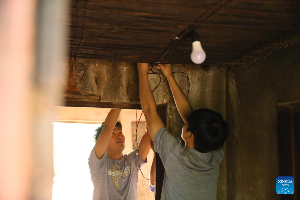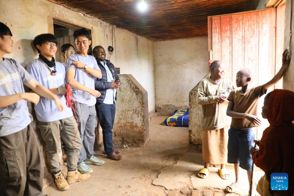 Estudantes da Universidade Politécnica de Hong Kong instalam fiação elétrica em casa de morador do distrito de Gisagara, Ruanda, no dia 16 de julho de 2025. Enfrentando o calor e a poeira no distrito de Gisagara, no sul de Ruanda, mais de 100 estudantes e professores da Universidade Politécnica de Hong Kong (PolyU) chegaram recentemente a vilarejos rurais para instalar painéis solares e sistemas de iluminação interna. (Foto por Huang Wanqing/Xinhua)