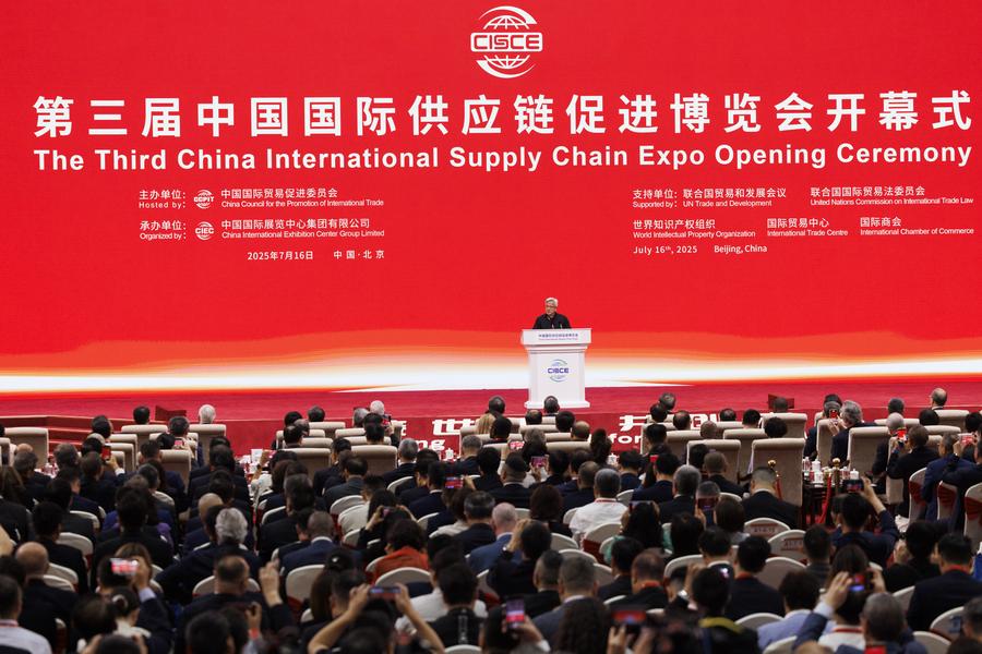 O CEO da Nvidia, Jensen Huang, discursa na cerimônia de abertura da 3ª Exposição Internacional da Cadeia de Suprimentos da China (CISCE, na sigla em inglês) em Beijing, capital da China, no dia 16 de julho de 2025. (Xinhua/Jin Liwang)
