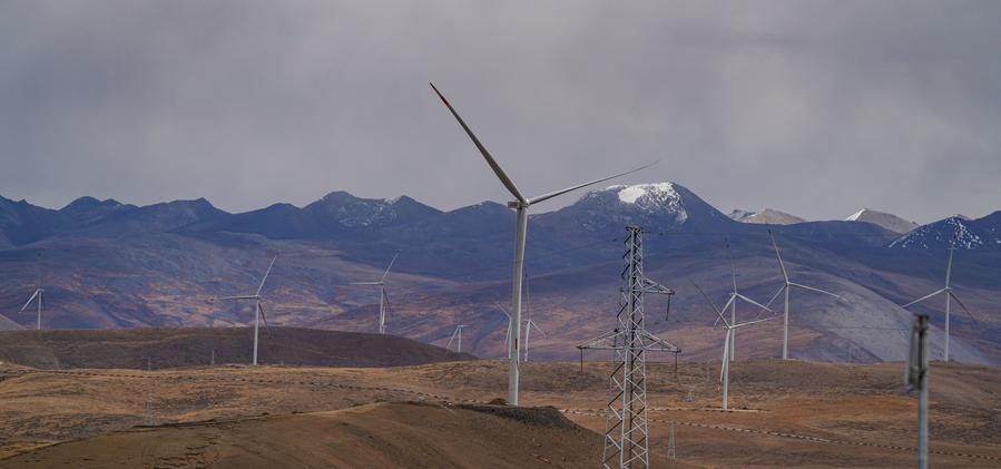 Foto mostra turbinas eólicas no distrito de Sa'gya, na cidade de Xigaze, na Região Autônoma de Xizang, no sudoeste da China, em 17 de outubro de 2024. (Xinhua/Jigme Dorje)