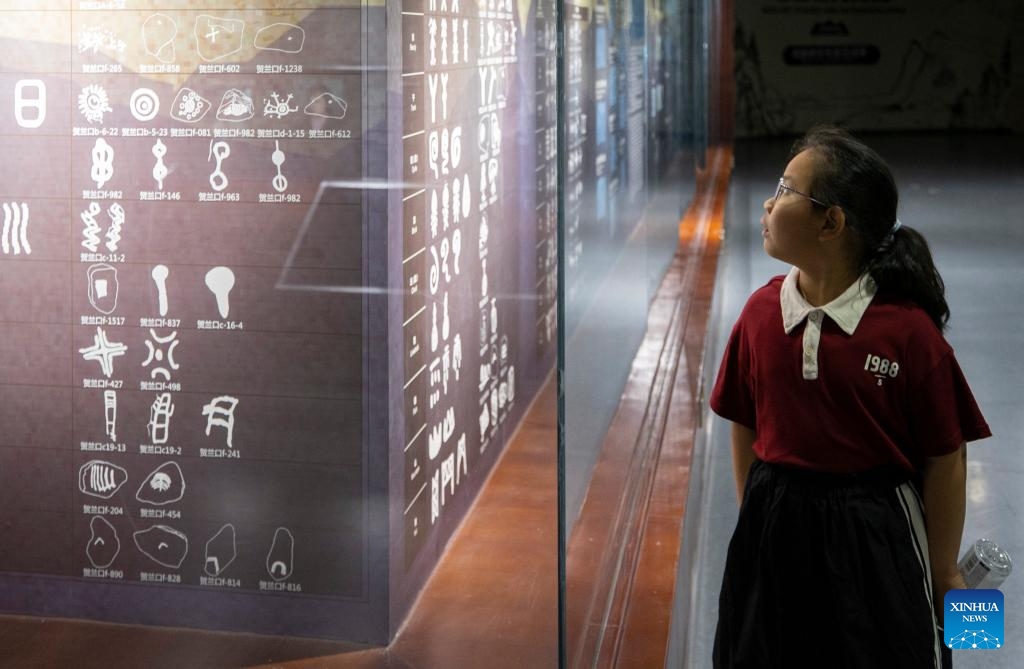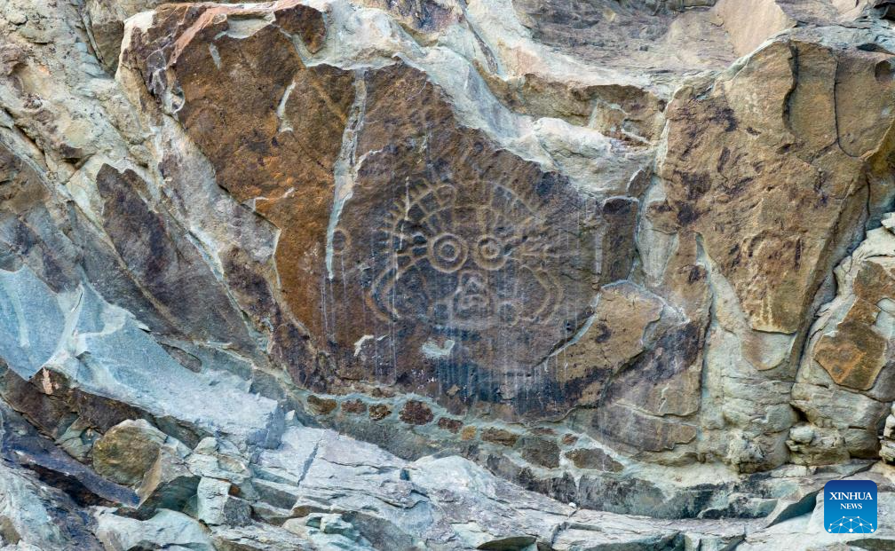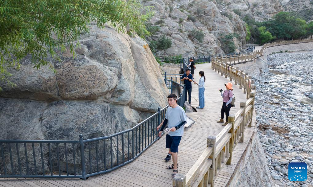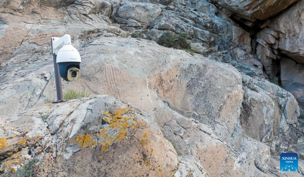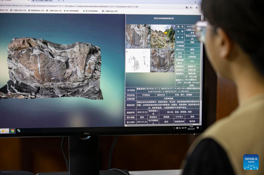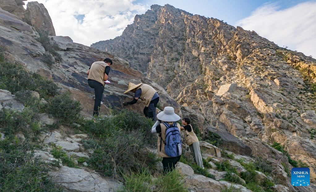 Funcionários trabalham na conservação de pinturas rupestres na Montanha Helan em Yinchuan-Xinhua