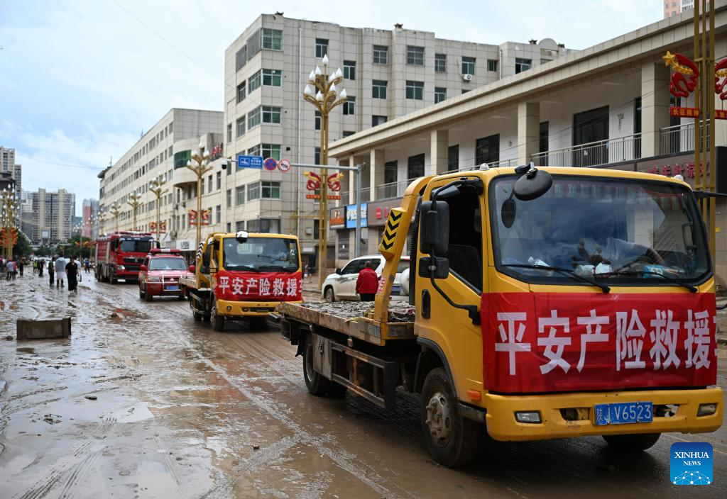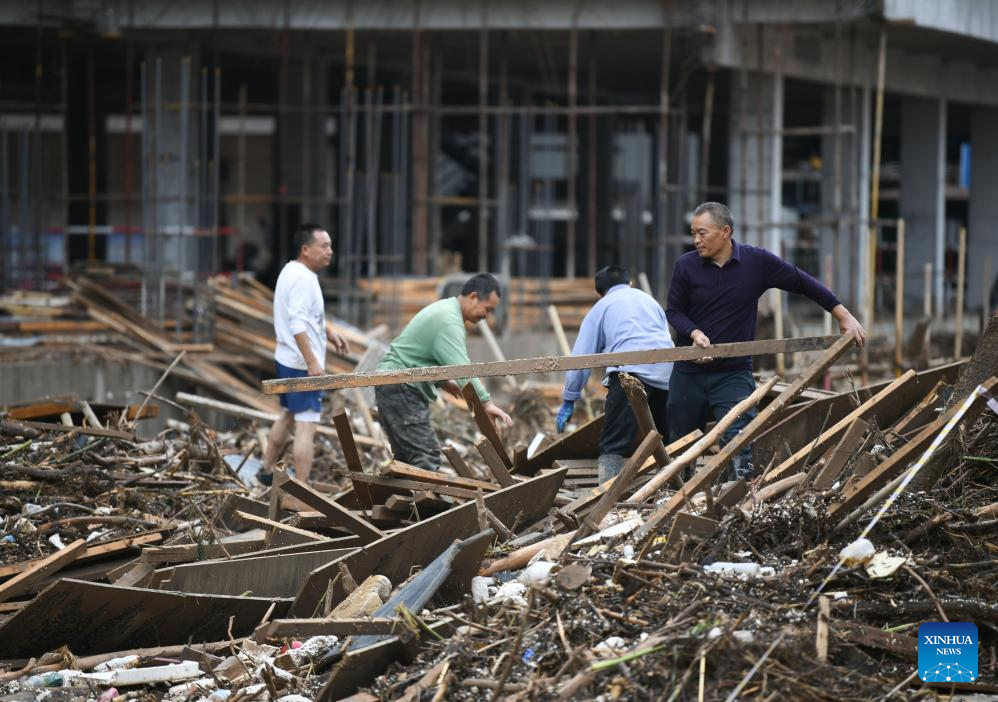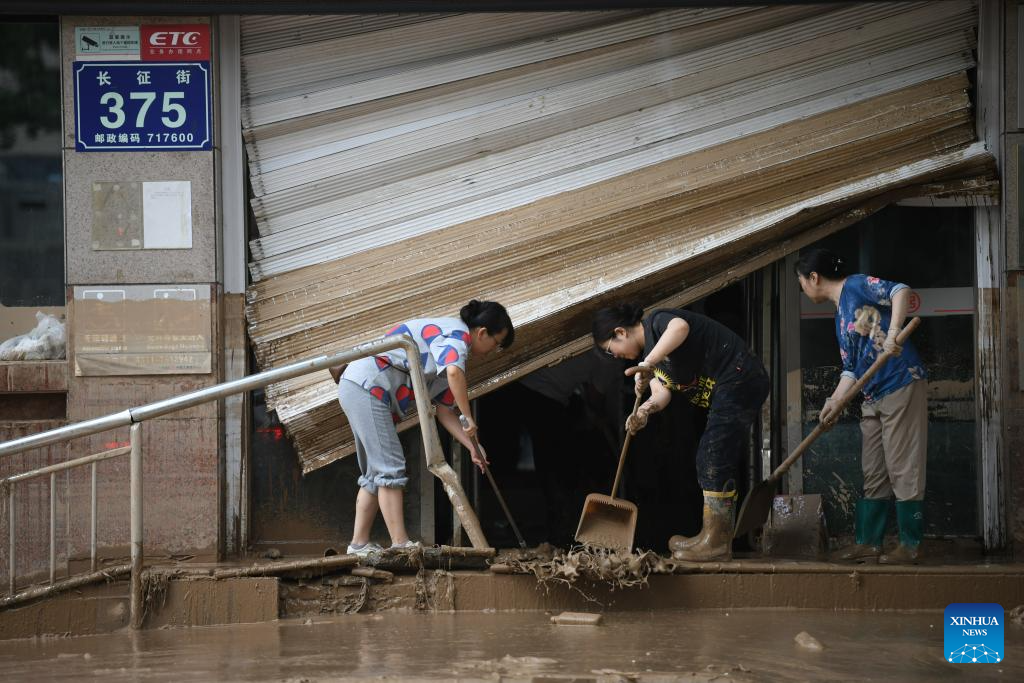 Trabalho de alívio de desastres continua após enchente no Distrito de Wuqi, em Shaanxi, no noroeste da China-Xinhua