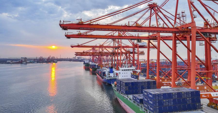 Foto de drone tirada em 16 de junho de 2025 mostra terminal de contêineres do Porto de Tangshan, em Tangshan, província de Hebei, norte da China. (Foto por Liu Mancang/Xinhua)