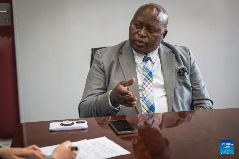 Mokhethi Shelile, ministro do Comércio, Indústria, Desenvolvimento Empresarial e Turismo do Lesoto, fala em entrevista exclusiva à Xinhua em Maseru, Lesoto, em 29 de julho de 2025. (Xinhua/Wang Guansen)