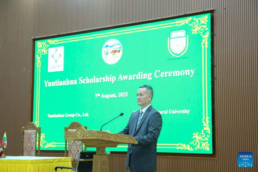 O ministro da Agricultura, Pecuária e Irrigação de Mianmar, U Min Naung, discursa na sexta cerimônia de premiação da Bolsa de Estudos Yuntianhua na Universidade Agrícola Yezin, em Nay Pyi Taw, Mianmar, em 7 de agosto de 2025. A sexta cerimônia de premiação da Bolsa de Estudos Yuntianhua foi realizada na Universidade Agrícola Yezin em Nay Pyi Taw, Mianmar, na quinta-feira. O Yuntianhua Group Co., Ltd., um grupo industrial chinês abrangente, concedeu bolsas a 104 estudantes. (Xinhua/Myo Kyaw Soe)