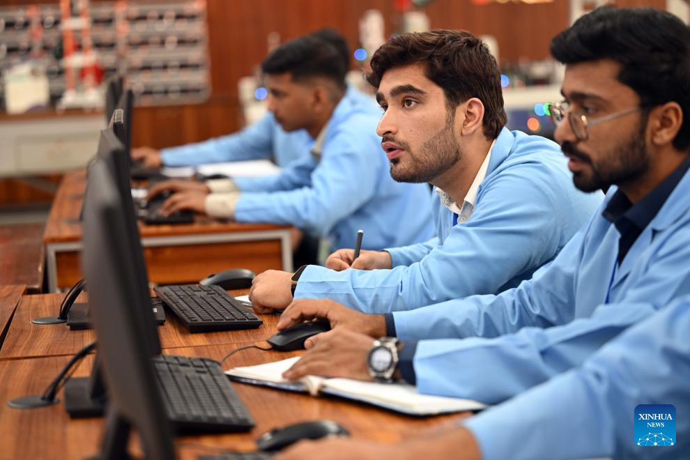 Estudantes operam uma máquina na Oficina Luban em Lahore, Paquistão, em 4 de agosto de 2025. A Oficina Luban tem laboratórios de treinamento modernos, equipamentos e plataformas digitais de aprendizagem em conformidade com os padrões técnicos chineses, e já treinou mais de 1.000 estudantes até o momento. (Xinhua/Ahmad Kamal)