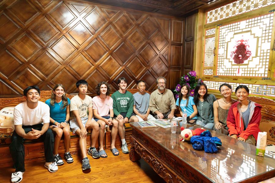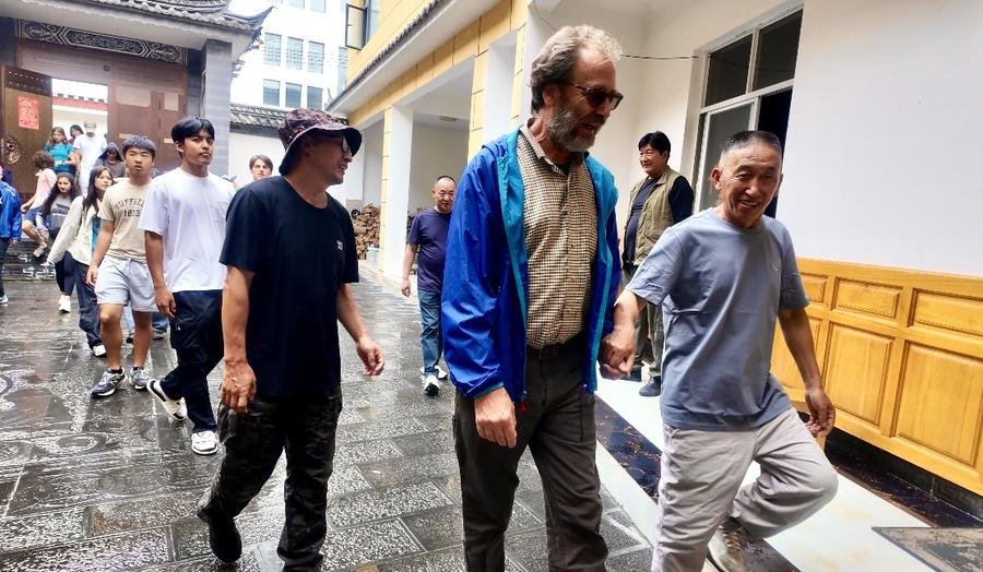 John Flower (esquerda, frente) lidera grupo de estudantes americanos em visita à residência de Zhang Jianhua (direita, frente) no distrito de Deqin, Prefeitura Autônoma Tibetana de Diqing, província de Yunnan, sudoeste da China, em 26 de julho de 2025. (Xinhua/Wang Xiansi)