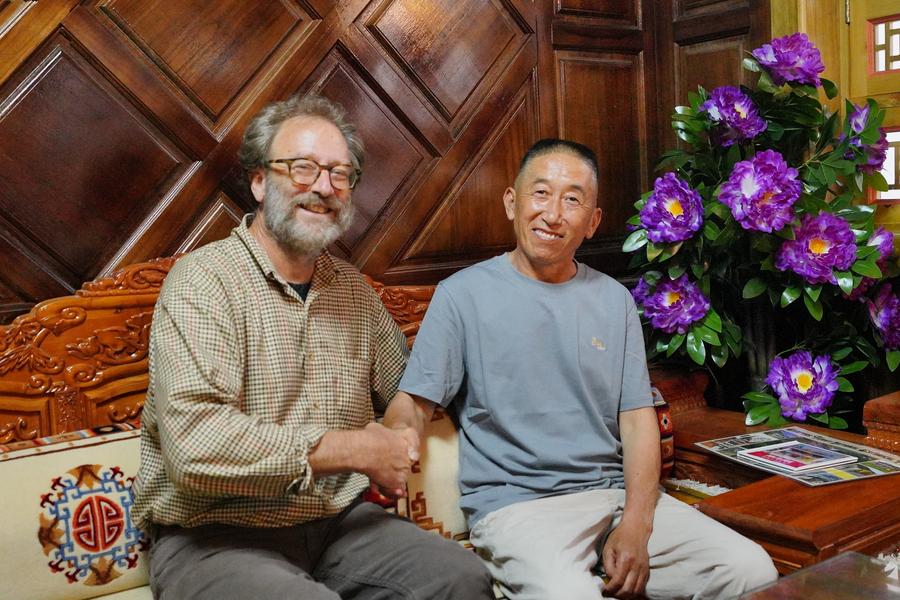 John Flower (esquerda) cumprimenta Zhang Jianhua durante visita à residência de Zhang no distrito de Deqin, Prefeitura Autônoma Tibetana de Diqing, província de Yunnan, sudoeste da China, em 26 de julho de 2025. (Xinhua/Gao Yongwei)