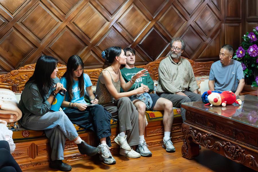 John Flower (2º à direita) e estudantes americanos conversam com Zhang Jianhua (1º à direita) na residência de Zhang no distrito de Deqin, Prefeitura Autônoma Tibetana de Diqing, província de Yunnan, sudoeste da China, 26 de julho de 2025. (Xinhua/Gao Yongwei)