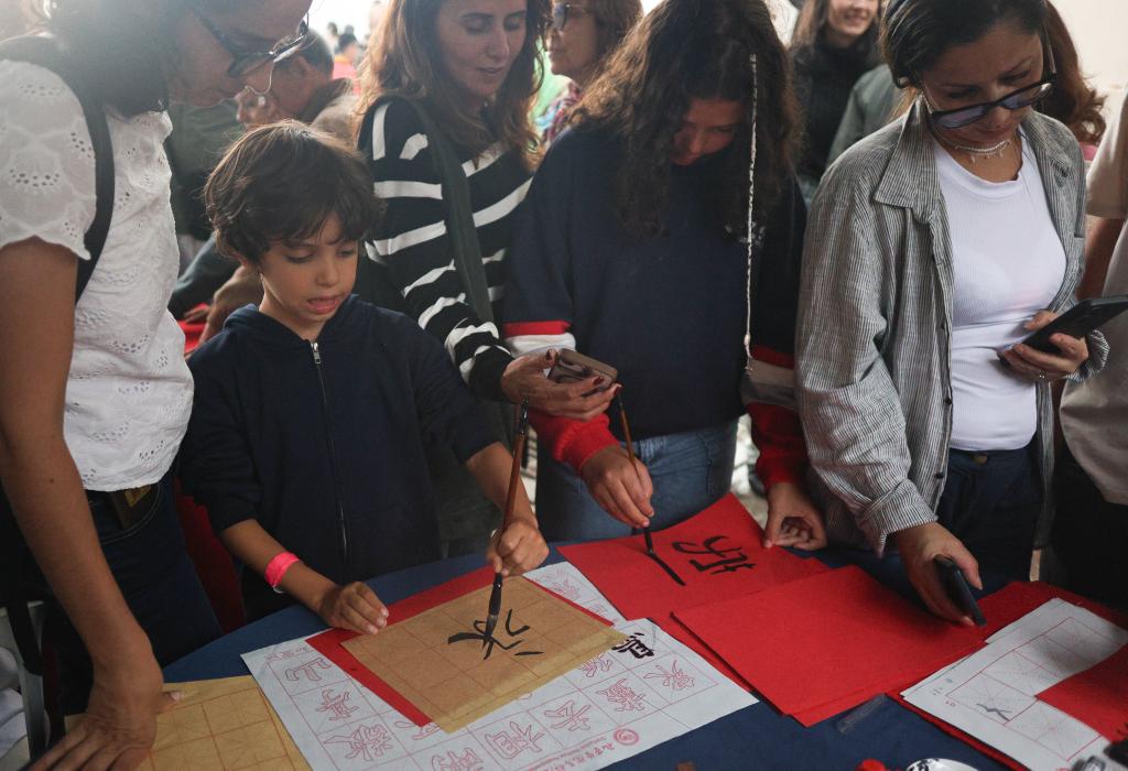 Pessoas realizam uma dança do dragão durante a celebração dos 51 anos de relações diplomáticas entre China e Brasil e dos 80 anos da vitória na Guerra Antifascista Mundial, no Forte de Copacabana, Rio de Janeiro, Brasil, em 16 de agosto de 2025. (Claudia Martini/Xinhua)Pessoas praticam caligrafia chinesa durante a celebração dos 51 anos de relações diplomáticas entre China e Brasil e dos 80 anos da vitória na Guerra Antifascista Mundial, no Forte de Copacabana, Rio de Janeiro, Brasil, em 16 de agosto de 2025. (Claudia Martini/Xinhua)Pessoas assistem a uma apresentação de dança do leão durante a celebração dos 51 anos de relações diplomáticas entre China e Brasil e dos 80 anos da vitória na Guerra Antifascista Mundial, no Forte de Copacabana, Rio de Janeiro, Brasil, em 16 de agosto de 2025. (Foto por Claudia Martini/Xinhua)Foto com o mascote panda durante a celebração dos 51 anos de relações diplomáticas entre China e Brasil e dos 80 anos da vitória na Guerra Antifascista Mundial, no Forte de Copacabana, Rio de Janeiro, Brasil, em 16 de agosto de 2025. (Claudia Martini/Xinhua)Pessoas visitam a exposição de intercâmbio cultural China-Brasil durante a celebração dos 51 anos de relações diplomáticas entre China e Brasil e dos 80 anos da vitória na Guerra Antifascista Mundial, no Forte de Copacabana, Rio de Janeiro, Brasil, em 16 de agosto de 2025. (Claudia Martini/Xinhua)