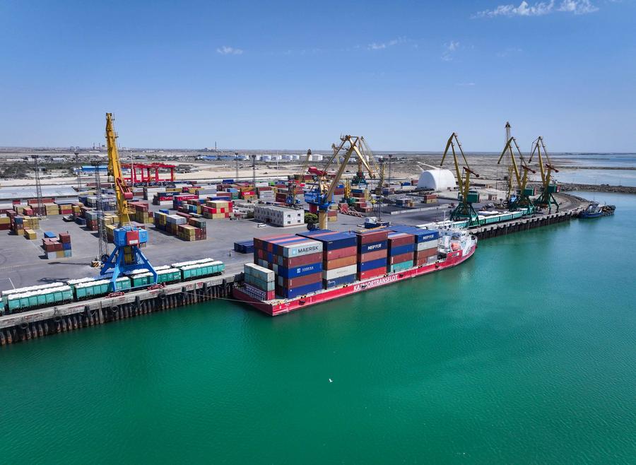Foto de drone tirada em 6 de agosto de 2025 mostra navio cargueiro atracado no porto de Aktau, no Cazaquistão. Aktau é o principal porto do Cazaquistão no Mar Cáspio. (Xinhua/Li Renzi)