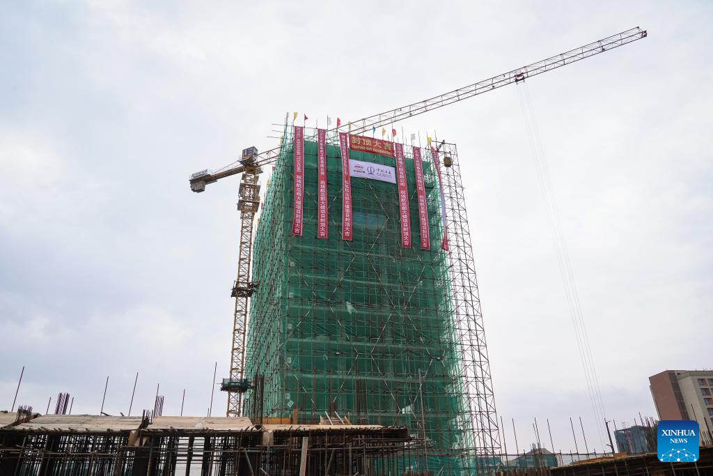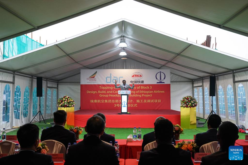 Adis Abeba, 18 ago (Xinhua) -- A nova sede do Ethiopian Airlines Group, em construção em Adis Abeba, capital do país do Leste Africano, atingiu seu topo, marcando a conclusão de suas principais obras estruturais.