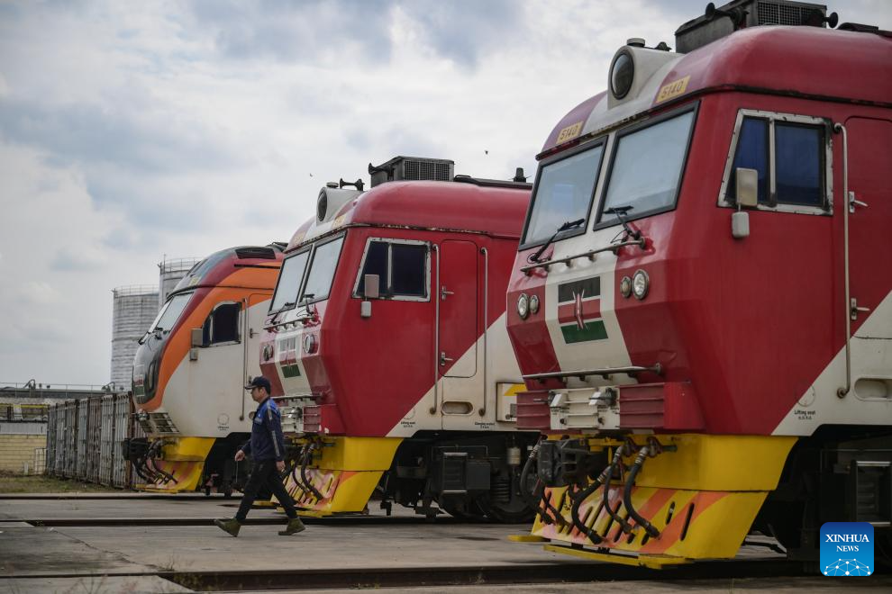 Foto aérea de drone mostra locomotivas em serviço na Ferrovia de Bitola Padrão Mombasa-Nairóbi no pátio de operação e manutenção de locomotivas da Africa Star Railway Operation Company Limited (Afristar) em Nairóbi, Quênia, em 19 de agosto de 2025. A Ferrovia de Bitola Padrão Mombasa-Nairóbi (SGR, na sigla em inglês), construída pela China, no Quênia, registrou 3.000 dias de operação segura até sábado, informou a Africa Star Railway Operation Company Limited (Afristar) em comunicado à imprensa no domingo. Desde seu lançamento em 31 de maio de 2017, a ferrovia transportou quase 15,93 milhões de passageiros e mais de 41,96 milhões de toneladas de carga, de acordo com a Afristar, que administra e mantém a linha. (Xinhua/Yang Guang)