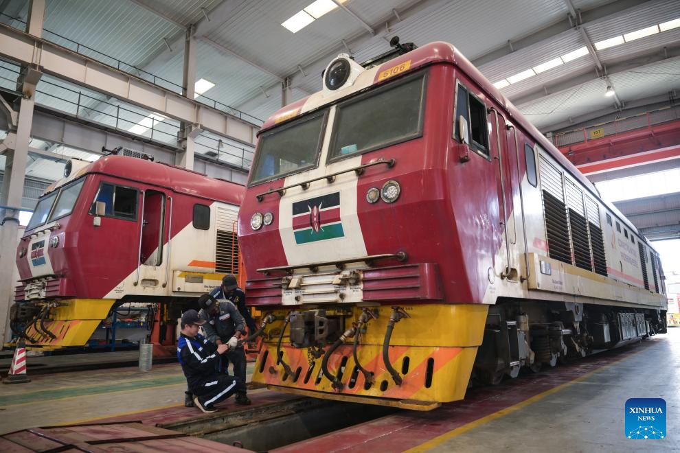 Trabalhadores verificam locomotiva na oficina de manutenção de locomotivas da Africa Star Railway Operation Company Limited (Afristar) em Nairóbi, Quênia, em 19 de agosto de 2025. A Ferrovia de Bitola Padrão Mombasa-Nairóbi (SGR, na sigla em inglês), construída pela China, no Quênia, registrou 3.000 dias de operação segura até sábado, informou a Africa Star Railway Operation Company Limited (Afristar) em comunicado à imprensa no domingo. Desde seu lançamento em 31 de maio de 2017, a ferrovia transportou quase 15,93 milhões de passageiros e mais de 41,96 milhões de toneladas de carga, de acordo com a Afristar, que administra e mantém a linha. (Xinhua/Yang Guang)