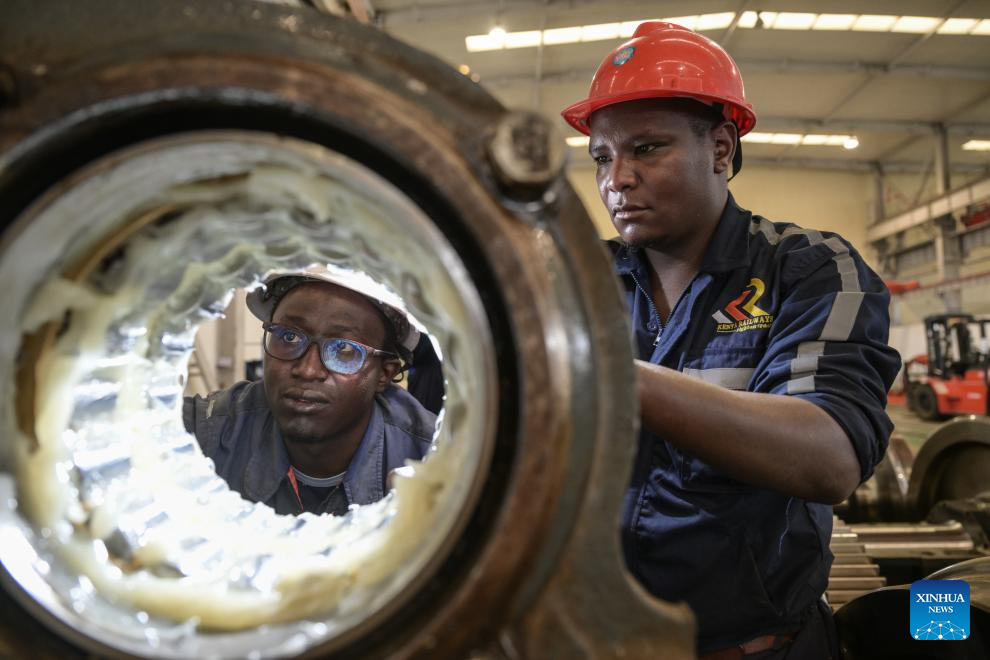 Trabalhadores quenianos Peter Langat (direita) e Char Les Onguti trabalham na oficina de manutenção de locomotivas da Africa Star Railway Operation Company Limited (Afristar) em Nairóbi, Quênia, em 19 de agosto de 2025. A Ferrovia de Bitola Padrão Mombasa-Nairóbi (SGR, na sigla em inglês), construída pela China, no Quênia, registrou 3.000 dias de operação segura até sábado, informou a Africa Star Railway Operation Company Limited (Afristar) em comunicado à imprensa no domingo. Desde seu lançamento em 31 de maio de 2017, a ferrovia transportou quase 15,93 milhões de passageiros e mais de 41,96 milhões de toneladas de carga, de acordo com a Afristar, que administra e mantém a linha. (Xinhua/Yang Guang)