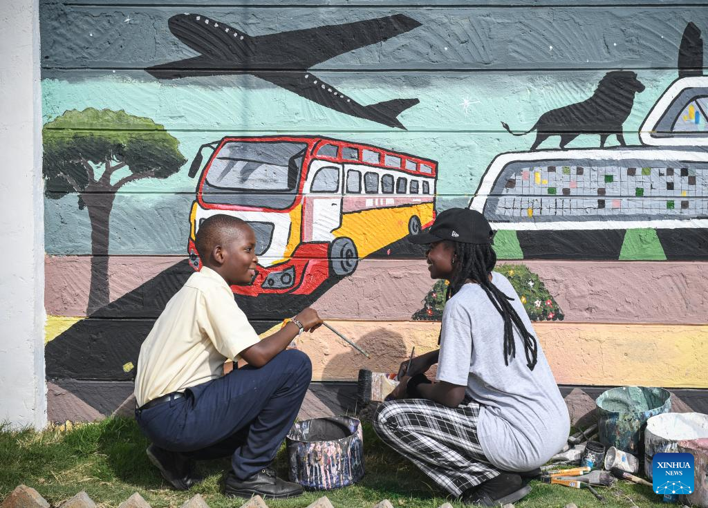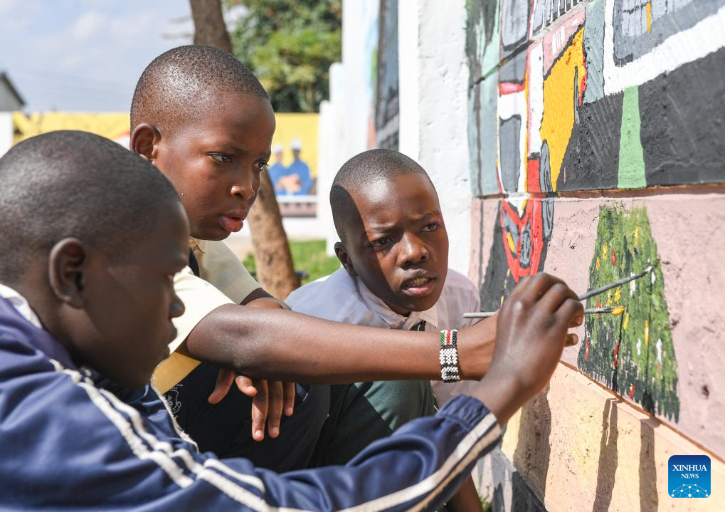 Crianças quenianas pintam mural em Nairóbi, Quênia, em 27 de agosto de 2025. (Xinhua/Li Yahui)