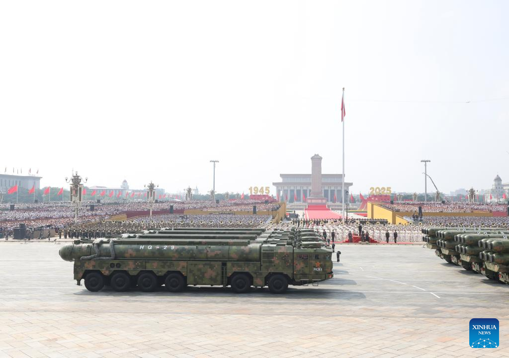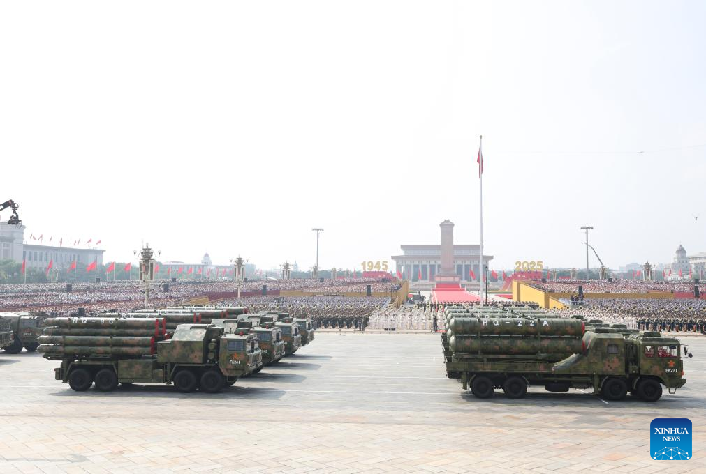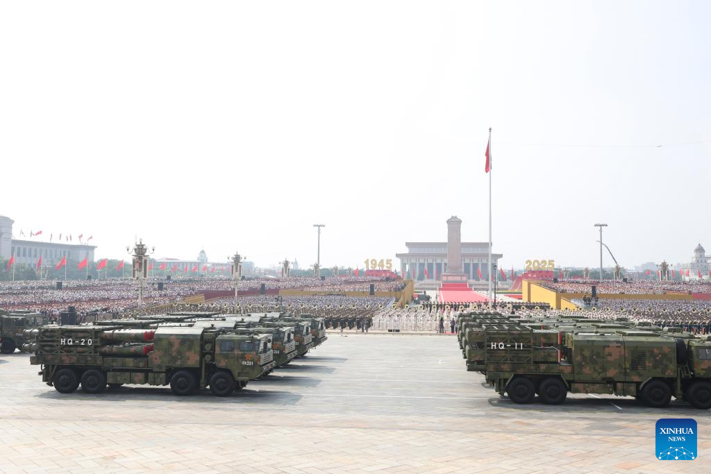 Beijing, 3 set (Xinhua) -- Uma série de armas de defesa aérea da China, incluindo HongQi-20, HongQi-19 e HongQi-29, se apresentou no desfile militar do Dia da Vitória da China, nesta quarta-feira.