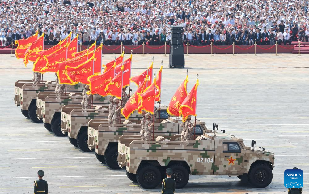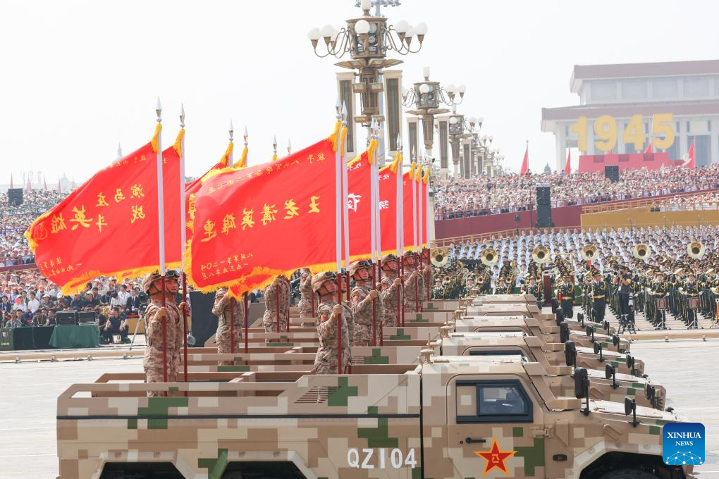 Helicópteros sobrevoaram a praça carregando faixas que diziam "A Justiça Prevalece", "A Paz Prevalece" e "O Povo Prevalece". Os soldados, bem equipados e com moral elevado, marcharam pela Avenida Chang'an (Paz Eterna) em formações firmes e poderosas, com rostos iluminados pela confiança e orgulho. Colunas de novos tanques, artilharia e outros equipamentos militares retumbavam pela praça.