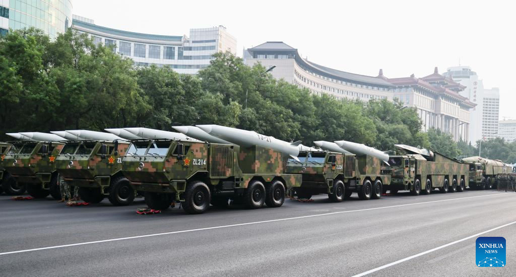 No desfile de quarta-feira, a China revelou suas forças estratégicas terrestres, marítimas e aéreas como a tríade nuclear pela primeira vez. Os armamentos, elogiados como o poder "trunfo" estratégico da China para salvaguardar a soberania e a dignidade nacional do país, incluíam o míssil de longo alcance de base aérea JingLei-1, o míssil intercontinental lançado por submarino JuLang-3, o míssil intercontinental de base terrestre DongFeng-61 e o novo tipo de míssil intercontinental de base terrestre DongFeng-31.