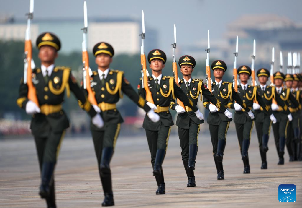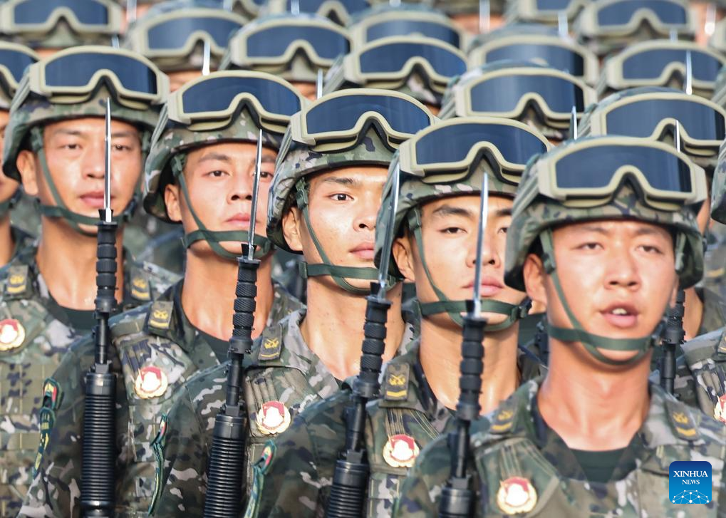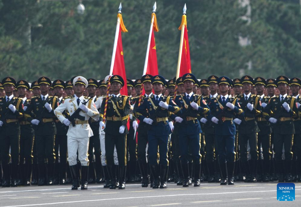 Tropas dos quatro serviços do Exército, da Marinha, da Força Aérea e da Força de Foguetes, bem como os quatro braços da Força Aeroespacial, da Força do Ciberespaço, da Força de Apoio à Informação e da Força Conjunta de Apoio Logístico, marcharam pela Praça Tian'anmen.