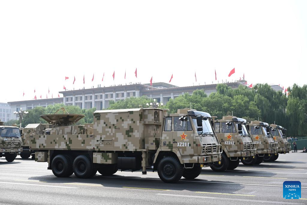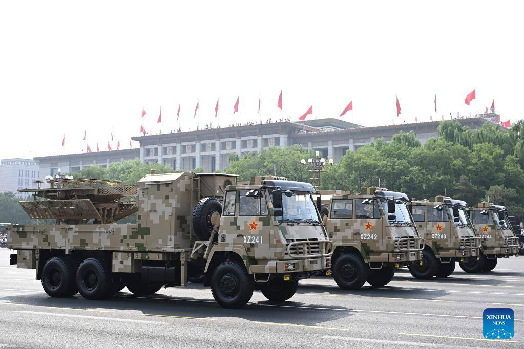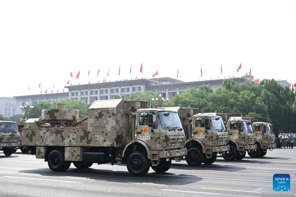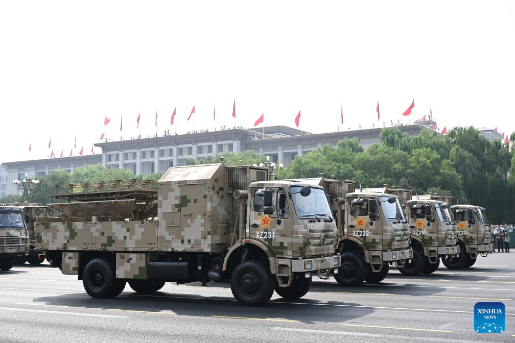 Beijing, 3 set (Xinhua) -- A China apresentou contramedidas eletrônicas no desfile do Dia da Vitória, nesta quarta-feira. Os cinco tipos de equipamentos de contramedida eletrônica incluídos na formação são capazes de realizar defesa e contramedidas aéreas e espaciais, além de desconectar redes inimigas e quebrar cadeias digitais.