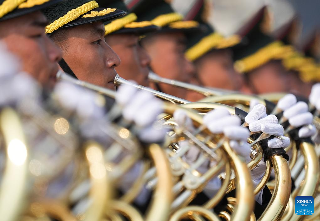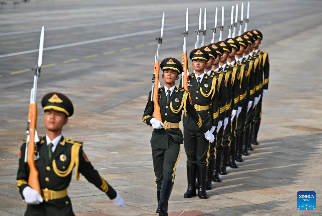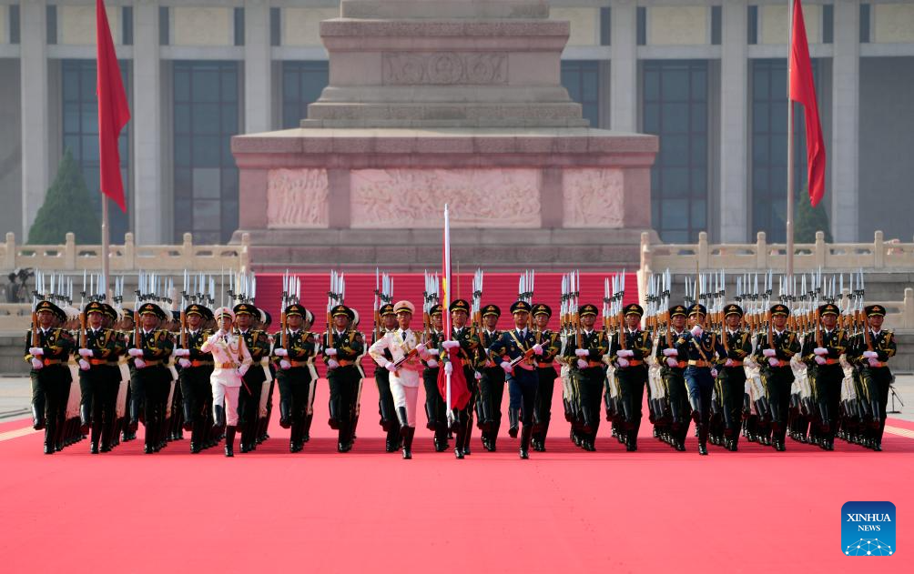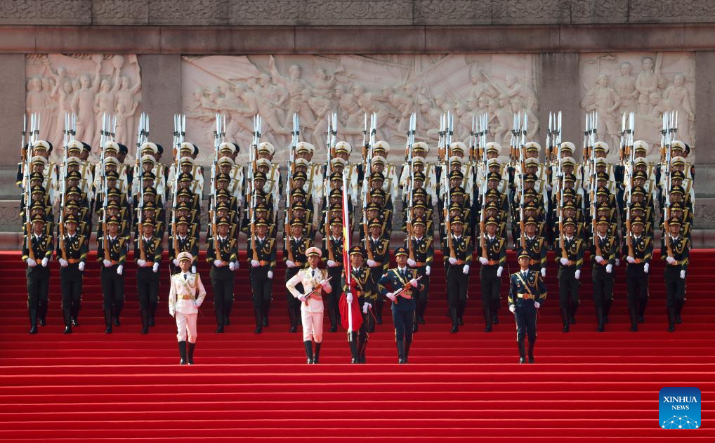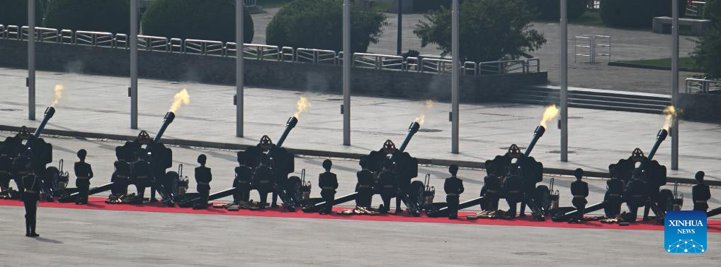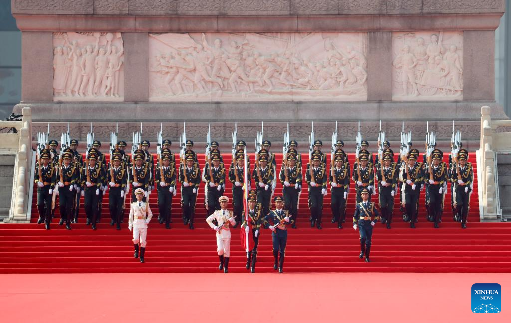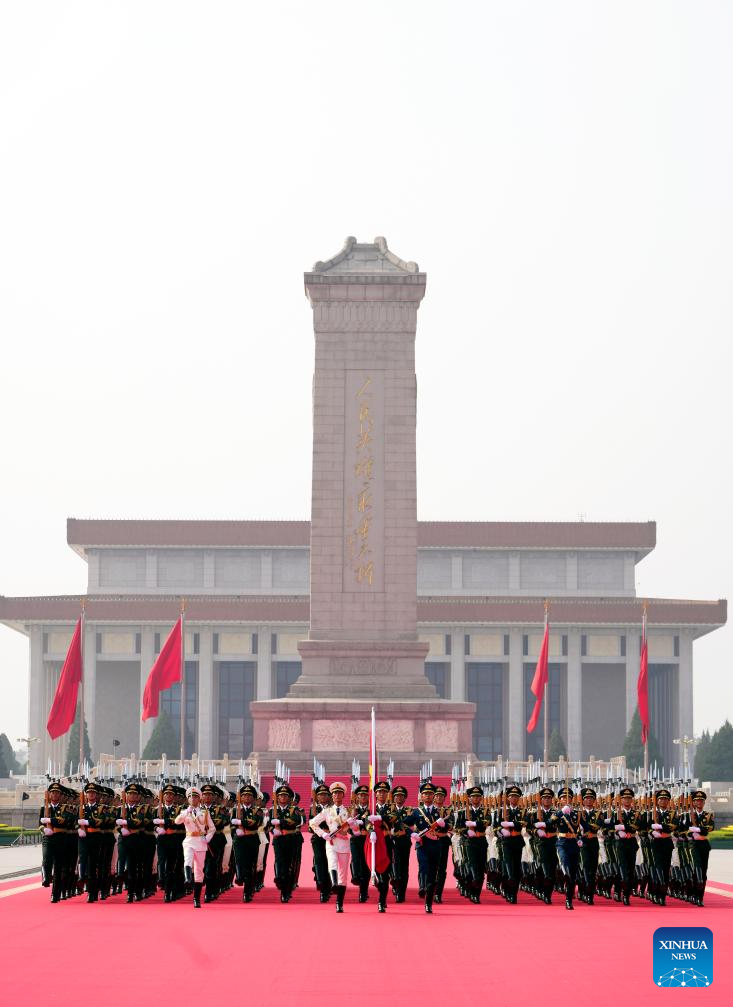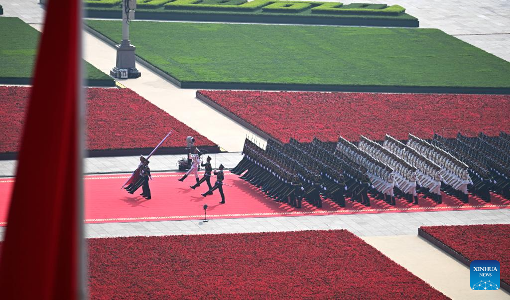 Em meio a salvas de canhão, a guarda de honra escoltou a bandeira nacional do Monumento aos Heróis do Povo, no centro da praça, em direção norte até o mastro.