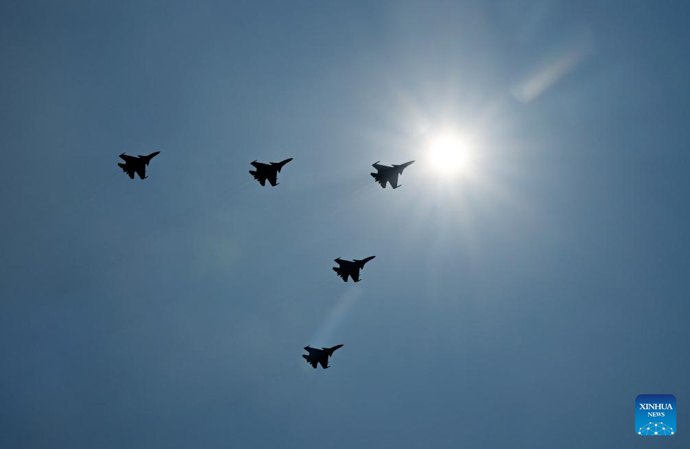 Beijing, 3 set (Xinhua) -- Os caças embarcados da China, J-15DH, J-15DT, J-35 e J-15T, sobrevoaram a Praça Tian'anmen no desfile militar do Dia da Vitória, nesta quarta-feira, em duas formações em V.
