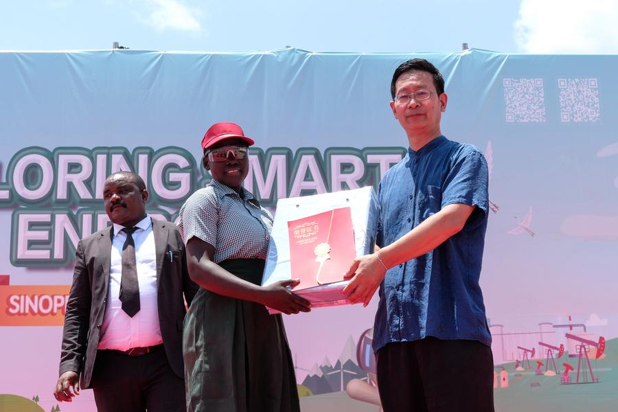 Zhang Lizhong (direita), embaixador da China em Uganda, entrega prêmio a uma participante do concurso de desenho no Dia de Portas Abertas ao Público, organizado pela petrolífera chinesa Sinopec, na Unidade Central de Processamento do campo petrolífero de Tilenga, em Buliisa, Uganda, em 13 de agosto de 2025. (Foto por Hajarah Nalwadda/Xinhua)