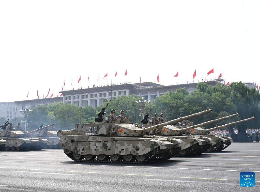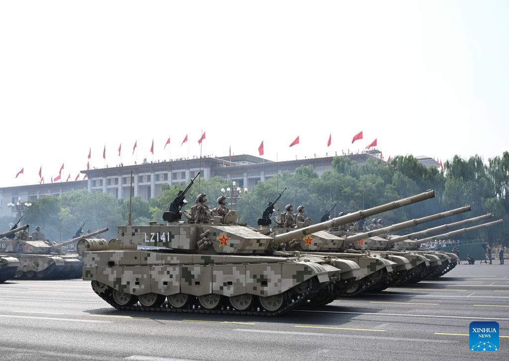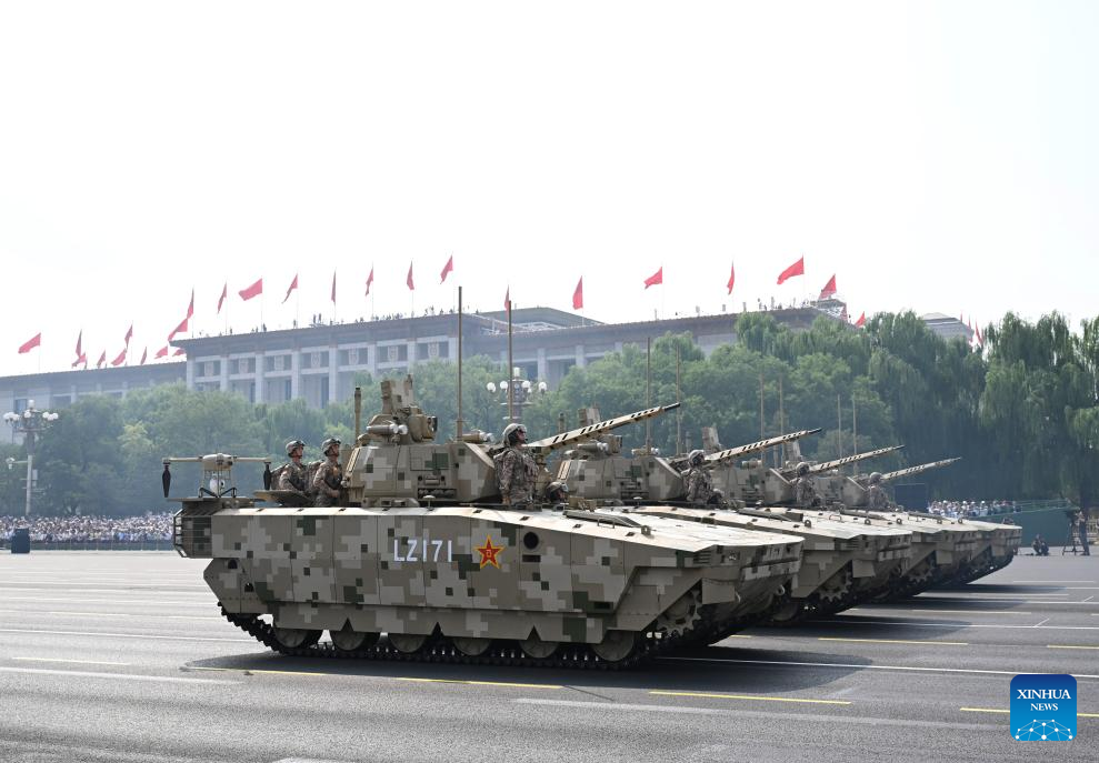 Beijing, 3 set (Xinhua) -- Uma formação de assalto terrestre composta por veículos blindados de nova geração do Exército de Libertação Popular, incluindo tanques Type-100 e veículos de combate Type-100, passou pela Praça Tian'anmen.