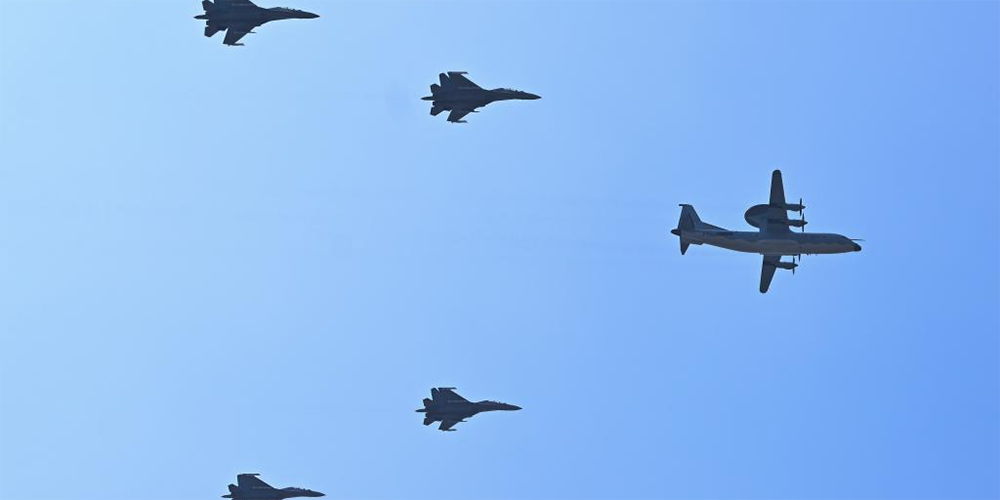 Escalões de aeronaves de alerta precoce e de comando sobrevoam Praça Tian'anmen em desfile