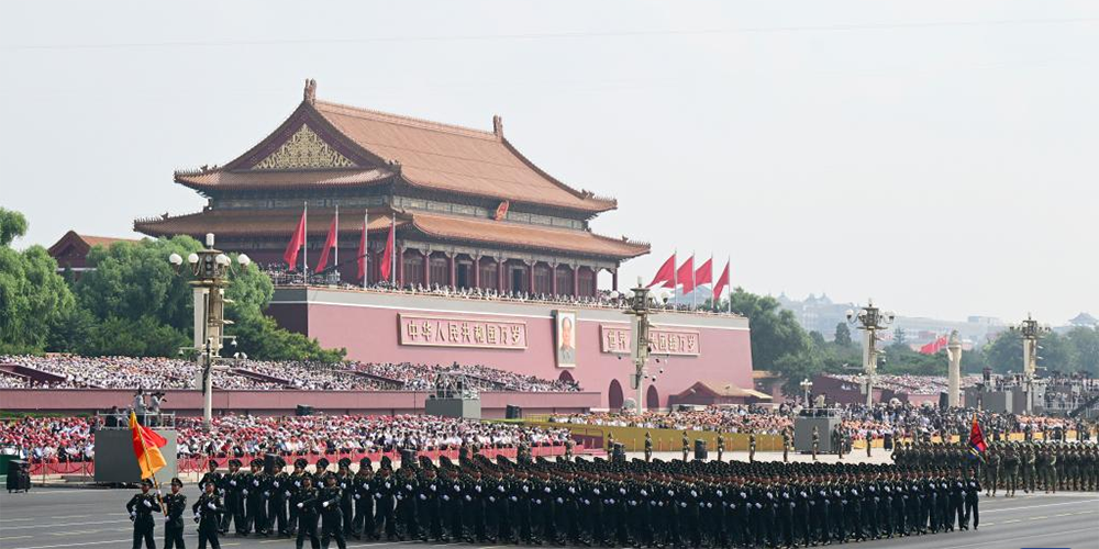 Formação de faixas das unidades heróicas marcha pela Praça Tian'anmen