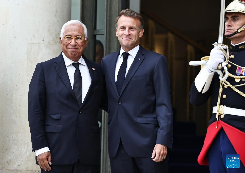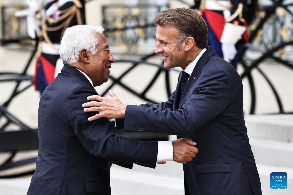 O presidente francês, Emmanuel Macron (2º à esquerda), cumprimenta o presidente do Conselho Europeu, Antonio Costa (esquerda), em sua chegada para participar da reunião da "Coalizão dos Dispostos" no Palácio do Eliseu, em Paris, França, em 4 de setembro de 2025. Macron anunciou na quinta-feira que 26 países, a maioria europeus, se comprometeram formalmente a enviar tropas como parte de um futuro cessar-fogo russo-ucraniano, embora não diretamente na linha de frente. (Xinhua/Gao Jing)
