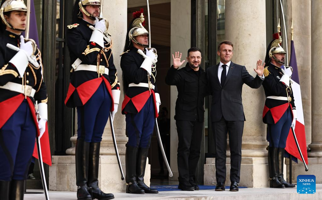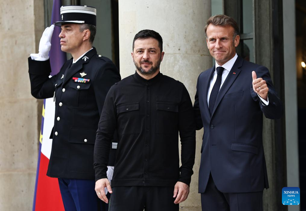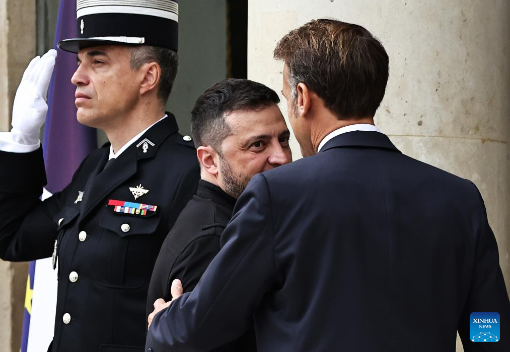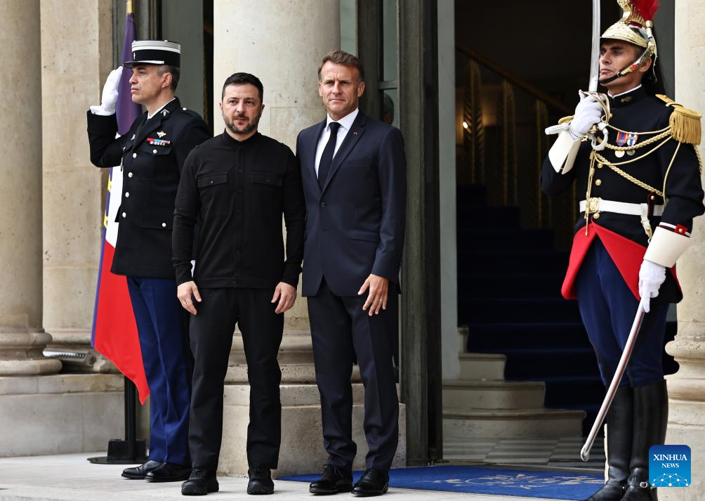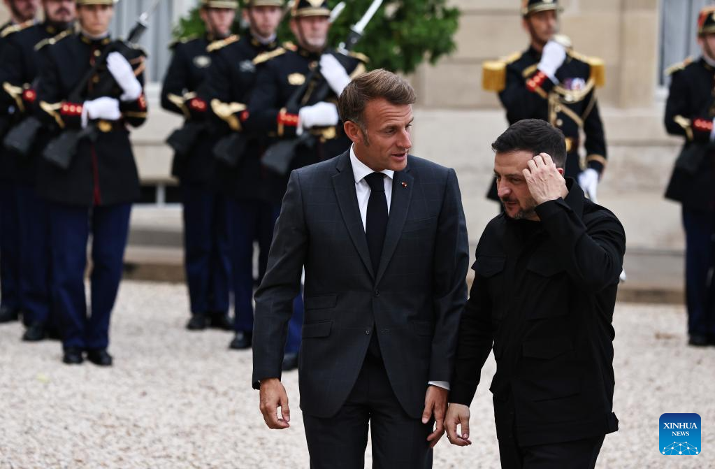 O presidente francês, Emmanuel Macron (direita), acena com o presidente ucraniano, Volodymyr Zelensky, em sua chegada para participar da reunião da "Coalizão dos Dispostos" no Palácio do Eliseu, em Paris, França, em 4 de setembro de 2025. Macron anunciou na quinta-feira que 26 países, a maioria europeus, se comprometeram formalmente a enviar tropas como parte de um futuro cessar-fogo russo-ucraniano, embora não diretamente na linha de frente. (Xinhua/Gao Jing)