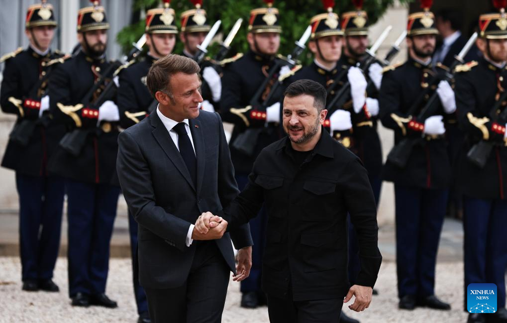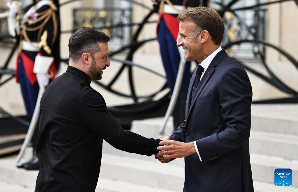 O presidente francês, Emmanuel Macron (direita), cumprimenta o presidente ucraniano, Volodymyr Zelensky, em sua chegada para participar da reunião da "Coalizão dos Dispostos" no Palácio do Eliseu, em Paris, França, em 4 de setembro de 2025. Macron anunciou na quinta-feira que 26 países, a maioria europeus, se comprometeram formalmente a enviar tropas como parte de um futuro cessar-fogo russo-ucraniano, embora não diretamente na linha de frente. (Xinhua/Gao Jing)