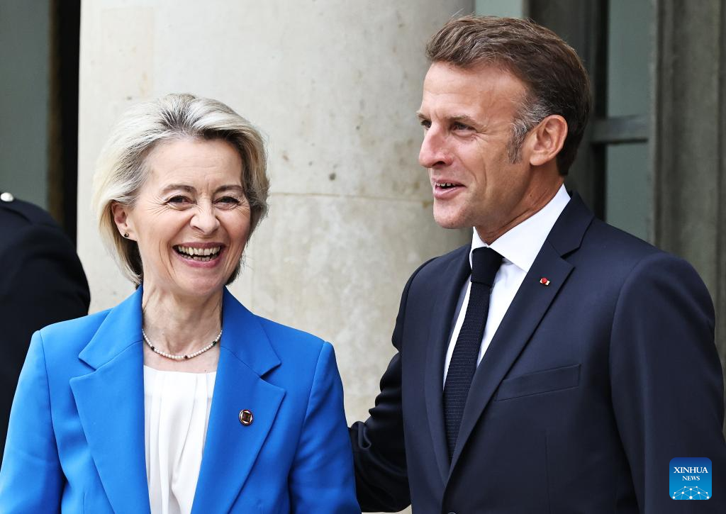 O presidente francês, Emmanuel Macron (direita), acena com a presidente da Comissão Europeia, Ursula von der Leyen, em sua chegada para participar da reunião da "Coalizão dos Dispostos" no Palácio do Eliseu, em Paris, França, em 4 de setembro de 2025. Macron anunciou na quinta-feira que 26 países, a maioria europeus, se comprometeram formalmente a enviar tropas como parte de um futuro cessar-fogo russo-ucraniano, embora não diretamente na linha de frente. (Xinhua/Gao Jing)