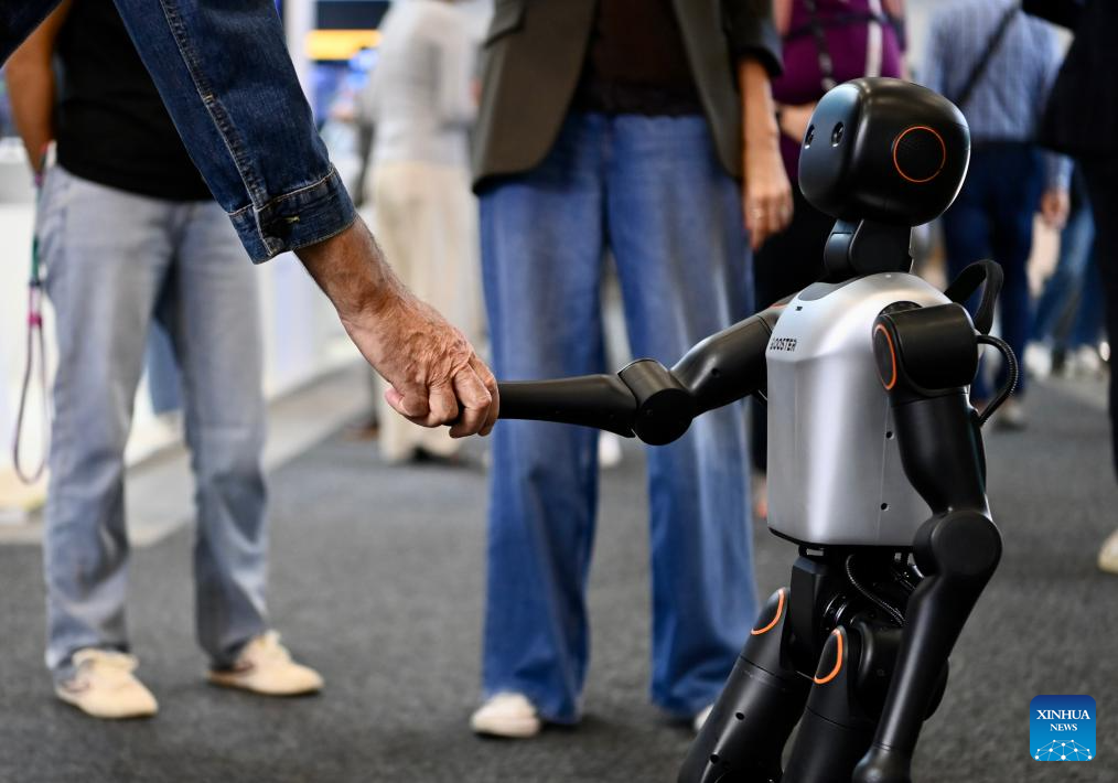 Visitante cumprimenta robô humanoide na IFA Berlin 2025, em Berlim, Alemanha, em 5 de setembro de 2025. A IFA Berlin 2025, uma das maiores feiras de eletrônicos de consumo e eletrodomésticos do mundo, foi inaugurada na sexta-feira, destacando temas voltados para o futuro, como tecnologia da informação, inteligência artificial, software e poder de computação, além de soluções sustentáveis para residências, mobilidade e estilo de vida. (Xinhua/Zhang Haofu)