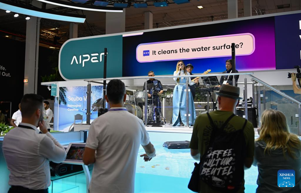 Banda se apresenta na área de exposição da Aiper na IFA Berlin 2025, em Berlim, Alemanha, em 5 de setembro de 2025. A IFA Berlin 2025, uma das maiores feiras de eletrônicos de consumo e eletrodomésticos do mundo, foi inaugurada na sexta-feira, destacando temas voltados para o futuro, como tecnologia da informação, inteligência artificial, software e poder de computação, além de soluções sustentáveis para residências, mobilidade e estilo de vida. (Xinhua/Zhang Haofu)