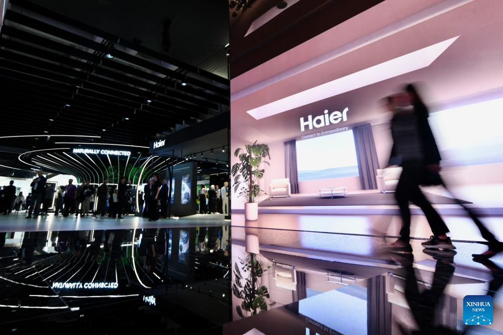 Área de exposição da Haier na IFA Berlin 2025, em Berlim, Alemanha, em 5 de setembro de 2025. A IFA Berlin 2025, uma das maiores feiras de eletrônicos de consumo e eletrodomésticos do mundo, foi inaugurada na sexta-feira, destacando temas voltados para o futuro, como tecnologia da informação, inteligência artificial, software e poder de computação, além de soluções sustentáveis para residências, mobilidade e estilo de vida. (Xinhua/Zhang Haofu)