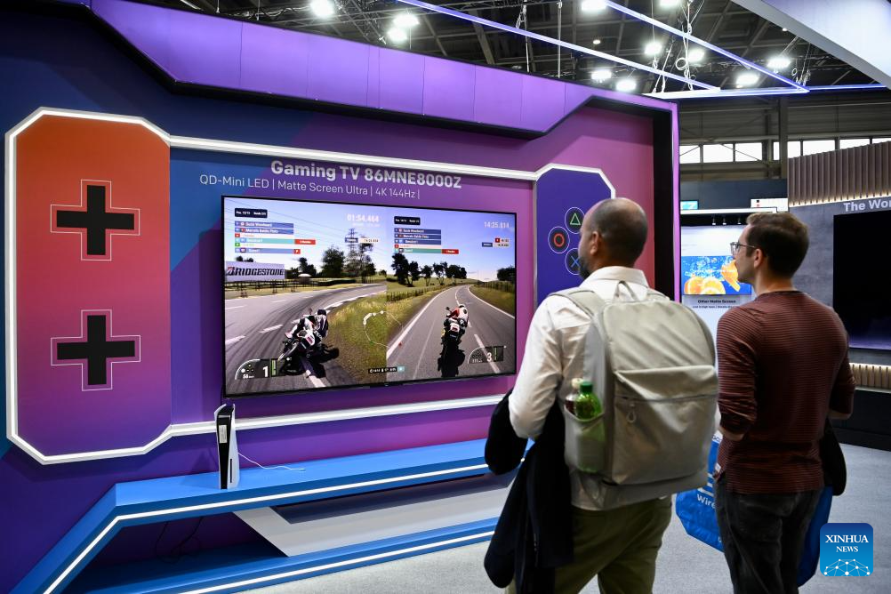 Pessoas testam TV gamer na área de exposição da METZ, na IFA Berlin 2025, em Berlim, Alemanha, em 5 de setembro de 2025. A IFA Berlin 2025, uma das maiores feiras de eletrônicos de consumo e eletrodomésticos do mundo, foi inaugurada na sexta-feira, destacando temas voltados para o futuro, como tecnologia da informação, inteligência artificial, software e poder de computação, além de soluções sustentáveis para residências, mobilidade e estilo de vida. (Xinhua/Zhang Haofu)