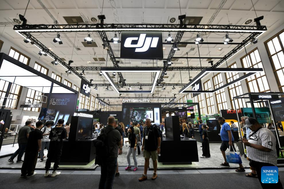 Área de exposição da DJI na IFA Berlin 2025, em Berlim, Alemanha, em 5 de setembro de 2025. A IFA Berlin 2025, uma das maiores feiras de eletrônicos de consumo e eletrodomésticos do mundo, foi inaugurada na sexta-feira, destacando temas voltados para o futuro, como tecnologia da informação, inteligência artificial, software e poder de computação, além de soluções sustentáveis para residências, mobilidade e estilo de vida. (Xinhua/Zhang Haofu)