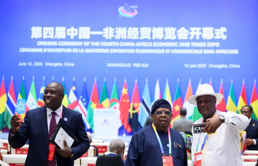 Foto tirada em 12 de junho de 2025 mostra convidados conversando antes da cerimônia de abertura da quarta Exposição Econômica e Comercial China-África em Changsha, província de Hunan, no centro da China. (Xinhua/Jin Liangkuai)