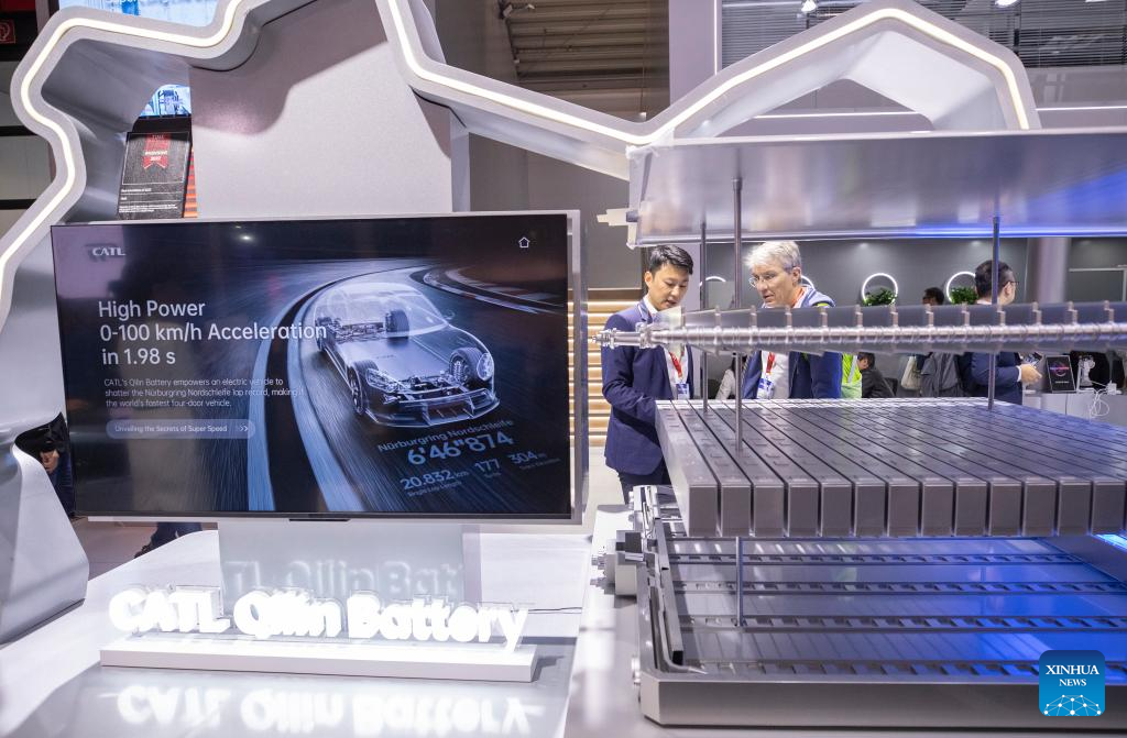Pessoas visitam a área de exposição da CATL na IAA Mobility 2025 em Munique, Alemanha, em 10 de setembro de 2025. A IAA Mobility 2025, uma das maiores feiras de mobilidade do mundo, começou na terça-feira, com montadoras e fornecedores globais apresentando veículos elétricos (EVs), direção autônoma e inovações baseadas em software. A China se destaca como a maior fonte de expositores estrangeiros, disseram os organizadores, com 116 empresas, incluindo as fabricantes de EVs BYD, Xpeng e Leapmotor, a gigante de baterias CATL e empresas de tecnologia como Zhuoyu e DeepRoute.ai. (Xinhua/Zhang Fan)