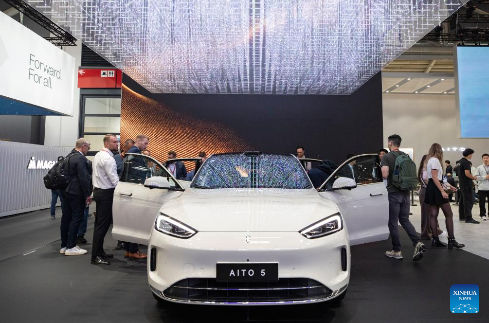 Pessoas visitam a área de exposição da AITO na IAA Mobility 2025 em Munique, Alemanha, em 10 de setembro de 2025. A IAA Mobility 2025, uma das maiores feiras de mobilidade do mundo, começou na terça-feira, com montadoras e fornecedores globais apresentando veículos elétricos (EVs), direção autônoma e inovações baseadas em software. A China se destaca como a maior fonte de expositores estrangeiros, disseram os organizadores, com 116 empresas, incluindo as fabricantes de EVs BYD, Xpeng e Leapmotor, a gigante de baterias CATL e empresas de tecnologia como Zhuoyu e DeepRoute.ai. (Xinhua/Zhang Fan)