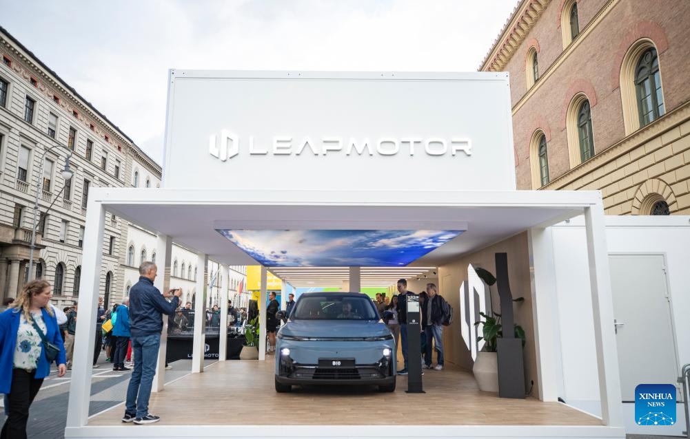 Pessoas visitam a área de exposição da Leapmotor na IAA Mobility 2025 em Munique, Alemanha, em 10 de setembro de 2025. A IAA Mobility 2025, uma das maiores feiras de mobilidade do mundo, começou na terça-feira, com montadoras e fornecedores globais apresentando veículos elétricos (EVs), direção autônoma e inovações baseadas em software. A China se destaca como a maior fonte de expositores estrangeiros, disseram os organizadores, com 116 empresas, incluindo as fabricantes de EVs BYD, Xpeng e Leapmotor, a gigante de baterias CATL e empresas de tecnologia como Zhuoyu e DeepRoute.ai. (Xinhua/Zhang Fan)
