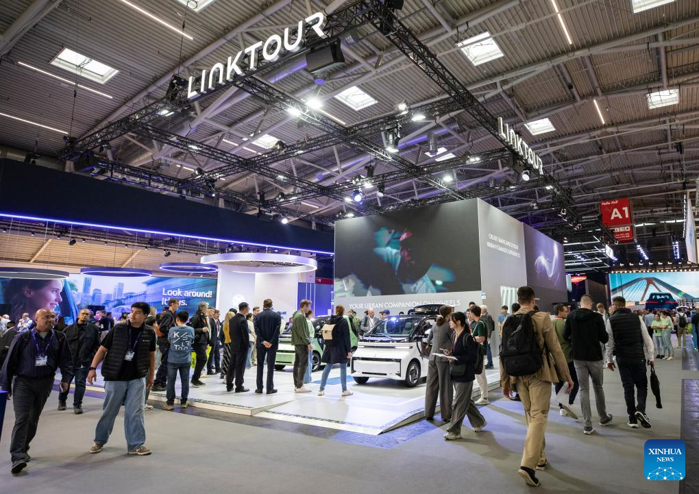 Pessoas visitam a área de exposição da LinkTour na IAA Mobility 2025 em Munique, Alemanha, em 10 de setembro de 2025. A IAA Mobility 2025, uma das maiores feiras de mobilidade do mundo, começou na terça-feira, com montadoras e fornecedores globais apresentando veículos elétricos (EVs), direção autônoma e inovações baseadas em software. A China se destaca como a maior fonte de expositores estrangeiros, disseram os organizadores, com 116 empresas, incluindo as fabricantes de EVs BYD, Xpeng e Leapmotor, a gigante de baterias CATL e empresas de tecnologia como Zhuoyu e DeepRoute.ai. (Xinhua/Zhang Fan)