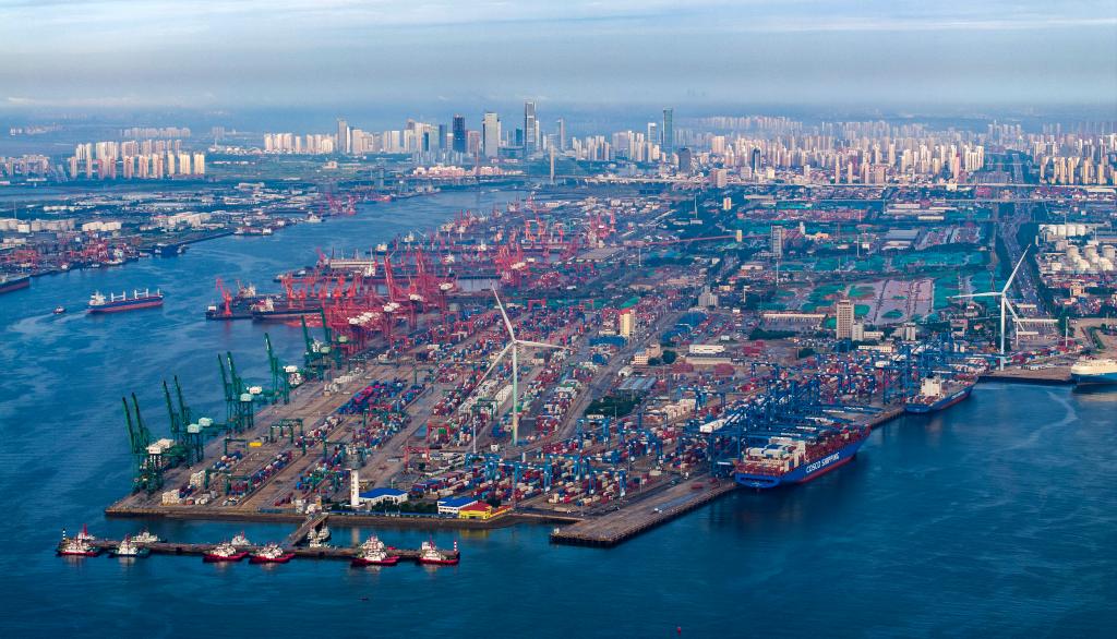 Foto aérea de drone tirada em 22 de agosto de 2025 mostra vista de um terminal de contêineres do Porto de Tianjin, no norte da China. (Xinhua/Zhao Zishuo)