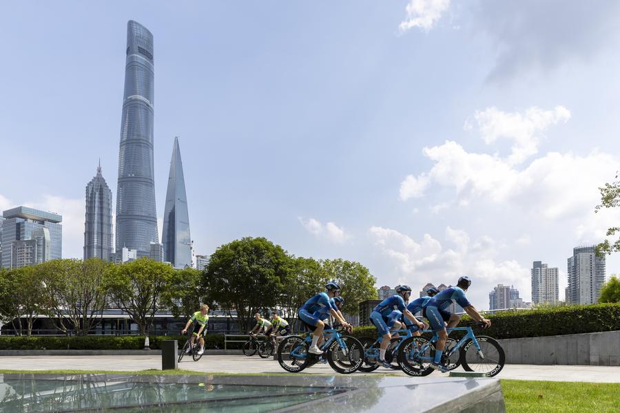 Ciclistas da equipe de ciclismo FNIX-SCOM-Hengxiang (direita) e ciclistas da Wagner Bazin WB participam de passeio antes do Tour de Shanghai 2025 da União Ciclística Internacional (UCI), em Shanghai, leste da China, em 4 de setembro de 2025. (Xinhua/Wang Xiang)