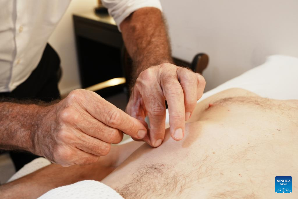 O acupunturista Gerad Kite faz tratamento de acupuntura em James Eden, produtor de cinema e também coautor de seu livro "The Untapped Self" (O Eu Inexplorado, em tradução livre), em Londres, Reino Unido, em 4 de setembro de 2025. (Xinhua/Zhao Jiasong)