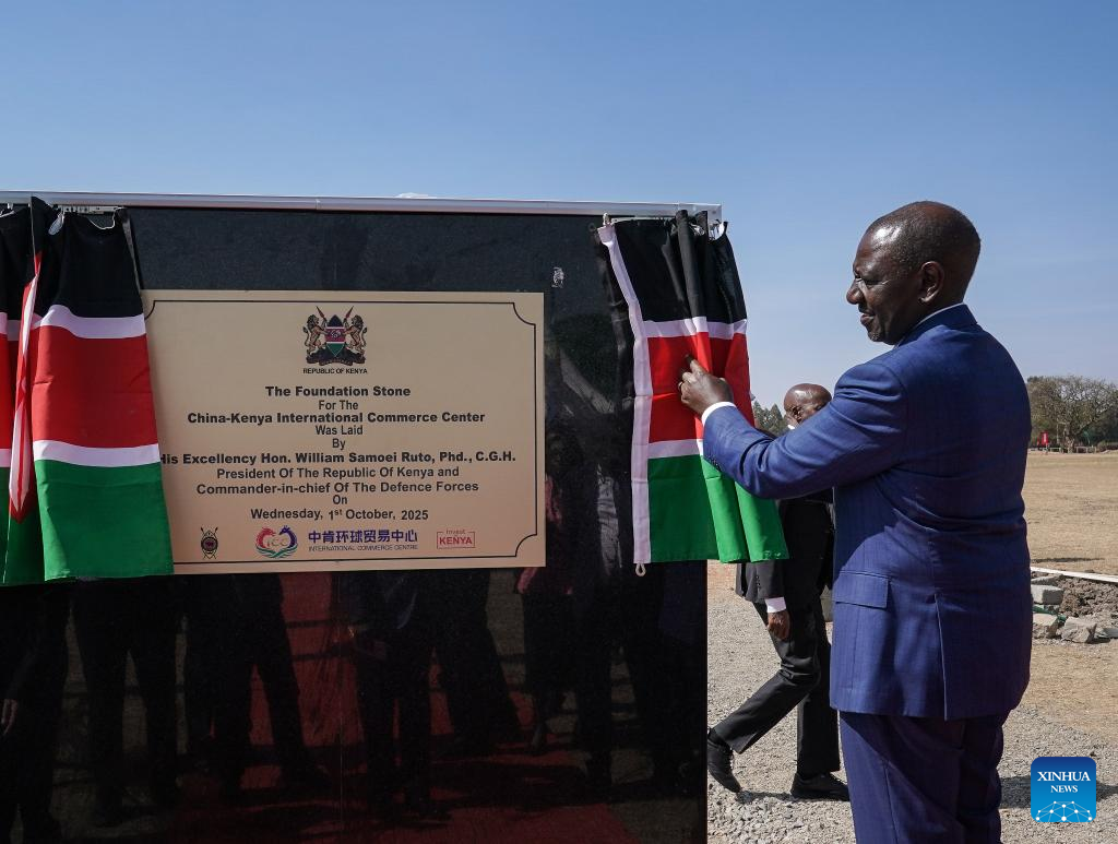 O presidente queniano, William Ruto (centro), participa da cerimônia de inauguração do Centro de Comércio Internacional China-Quênia em Nairóbi, Quênia, em 1º de outubro de 2025. Ruto inaugurou na quarta-feira a construção do Centro de Comércio Internacional China-Quênia, um projeto de cinco bilhões de xelins (cerca de 38,7 milhões de dólares americanos), destinado a fortalecer o comércio e os investimentos sino-quenianos. De acordo com Ruto, a instalação apresentará produtos da China, além de produtos fabricados localmente e destinados aos mercados globais. (Xinhua/Han Xu)